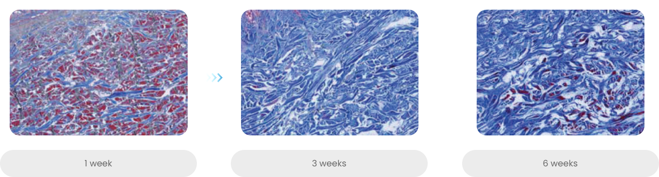 From 1 to 3 to 6 weeks after engraftment, collagen fiber formation increased significantly over time.