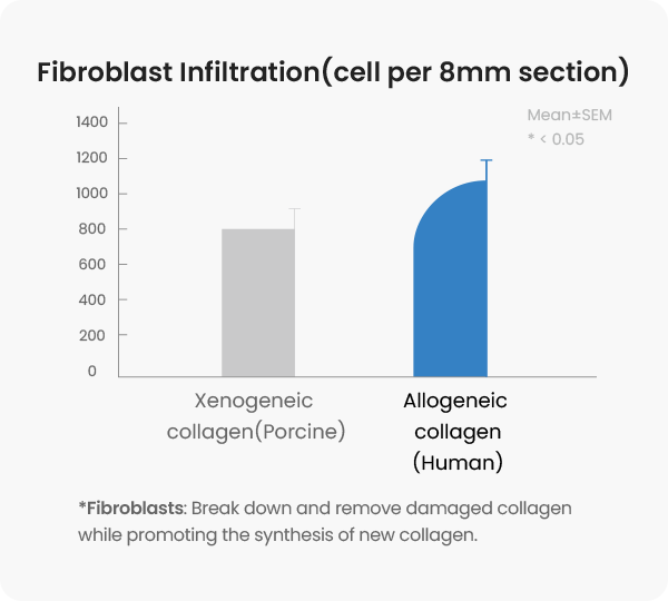 Compared with xenogeneic collagen, allogeneic collagen shows much higher fibroblast infiltration, making it more effective for soft tissue repair and regeneration.