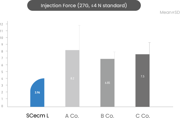 SCecm L, with its uniform particle size (71.8±0.3 μm) and consistently low injection force, can be administered using needles as fine as 27G, helping to minimize injection pain.
