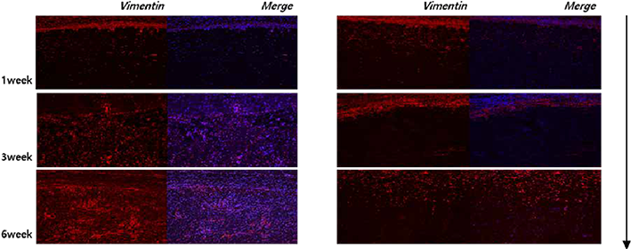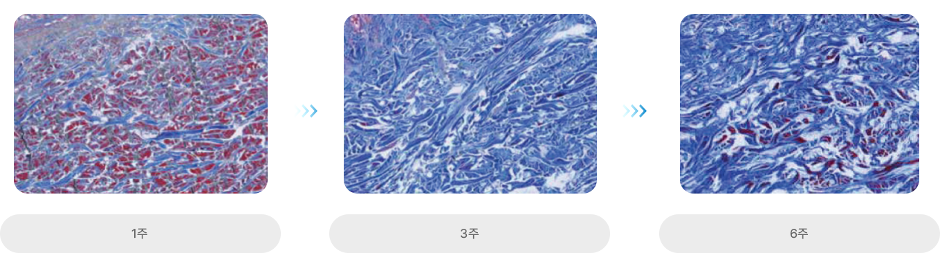 정상 생착 후 1주 → 3주 → 6주 시간 경과에 따라 콜라겐 섬유 생성이 유의미하게 증가