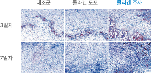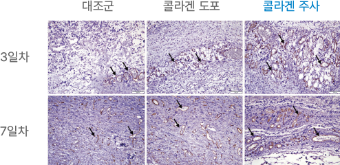손상 조직에 콜라겐 보충(도포 및 주사) 시, 3일차부터 혈관 신생이 유의미하게 증가하였습니다.