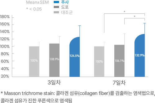손상 조직에 콜라겐 보충(도포 및 주사) 시,7일 후 콜라겐 생성이 유의미하게 증가하였습니다.