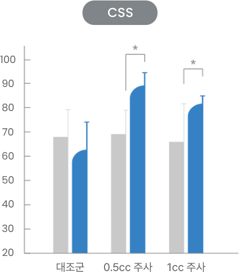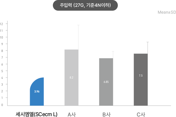 SCecm L은 균일한 입자 크기*(71.8±0.3㎛)와 일정하고 낮은 주입력으로 27G needle까지 사용 가능하여 주사 시 통증 (injection pain)을 낮출 수 있습니다.
