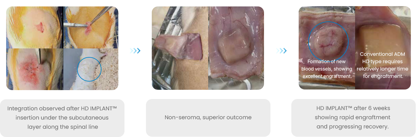 Confirmed that HD IMPLANT™ achieves rapid engraftment between the fascia and muscle layer in rats, forming new blood vessels.