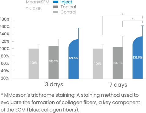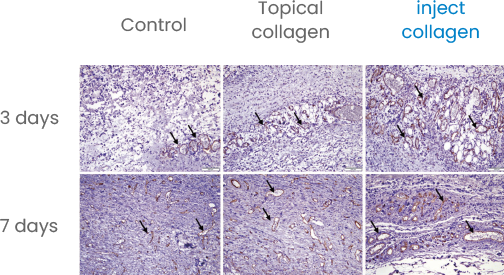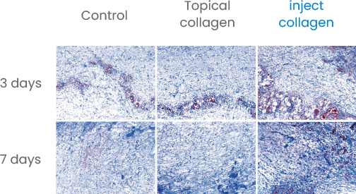 Collagen supplementation (topical & injectable) in damaged tissue led to a significant increase in collagen production after 7 days.