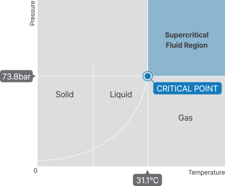일정 온도와 압력(임계점) 이상의 상태에서 각 물질별 임계점은 고유한 값을 가집니다.(당사에서는 이산화탄소 사용) 액체와 같은 밀도로 충분한 용해력과 기체와 같은 낮은 표면장력으로 우수한 투과성을 보입니다.