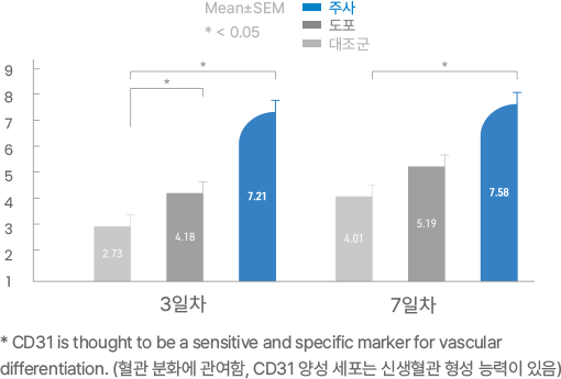 손상 조직에 콜라겐 보충(도포 및 주사) 시, 3일차부터 혈관 신생이 유의미하게 증가하였습니다.